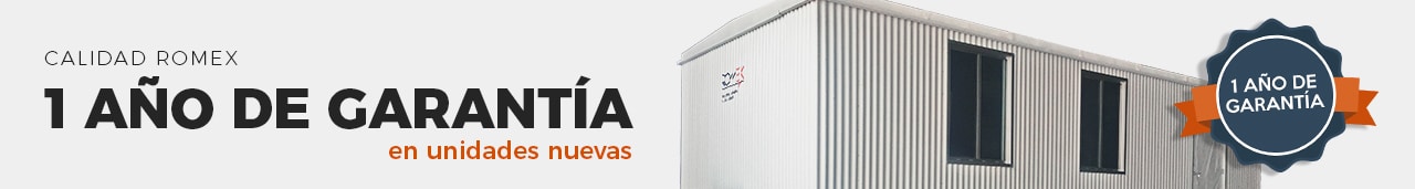 Nuestra garantía ROMEX es válida únicamente en unidades nuevas y productos fabricados por Remolques y Oficinas Mexicanas S. de R. L. de C. V. Para hacer válida la garantía el cliente debe solicitar la póliza de garantía a su asesor ROMEX la cual tendrá una validez de 1 año corriendo a partir de la fecha de compra de la unidad. La garantía es aplicable únicamente en la República Mexicana.